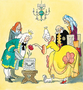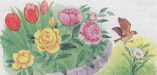 По сюжету ромашка росла в саду, но отдельно от других цветов и в частности пионов. Она им завидовала, что они красивые, а она неказистая, но жаворонок выбрал именно и ее чтобы поцеловать, чем рассердил пионов.