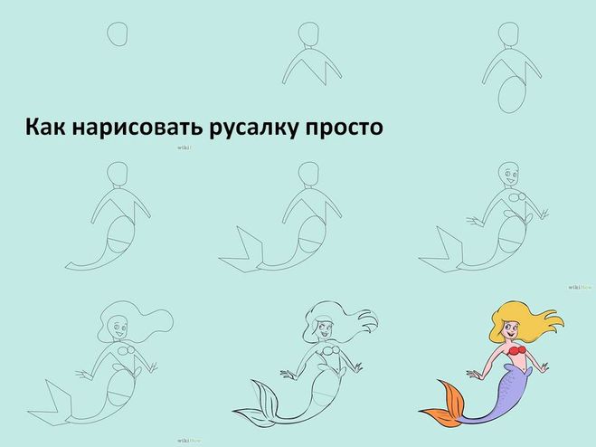 Эта сказка очень нравится многим и изобразить можно ее главную героиню — русалочку — девушку с рыбьим хвостом, с красивым лицом и распущенными длинными волосами.