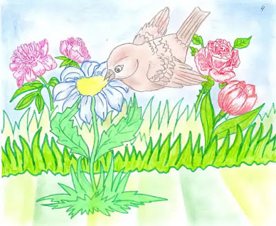 На переднем плане нарисуем сначала ромашку. Начнем с серединки желтой, а от нее можно уже добавлять лепестки, стебель, резные листья. Рядом нарисуем птичку жаворонка. Прорисуем небольшую голову, плотное тело, два крыла и хвост. На заднем плане нарисуем пионы и траву. Можно сразу рисовать цветными карандашами, а можно сначала сделать эскиз и потом уже раскрашивать готовый рисунок.
