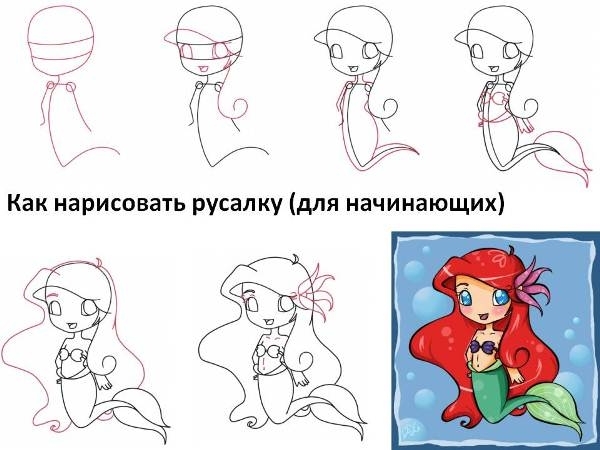 Если русалочка показана как мультипоткационный персонаж, то можно рисовать ее с более объемной головой по сравнению с телом.