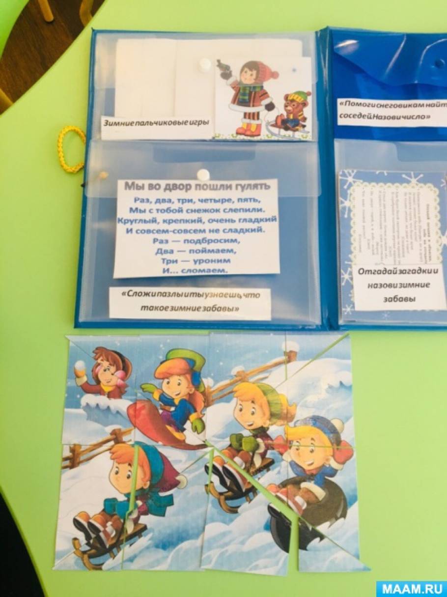— «Собери пазлы»(Собери пазлы и ты узнаешь, что такое зимние забавы); — картотека «Зимние пальчиковые игры»;