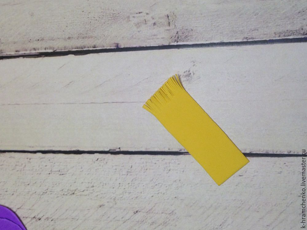 Желтый прямоугольник нужно превратить в пестик для нашего крокуса. С края, ширина которого 1,5 см, делаем бахрому, длиной 7 мм.