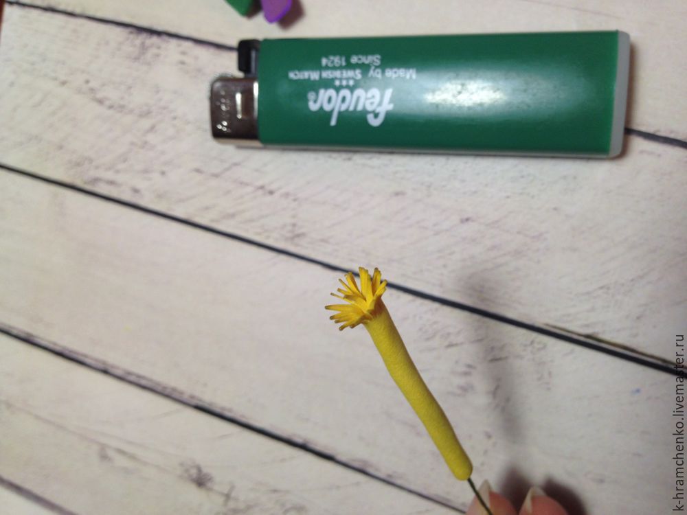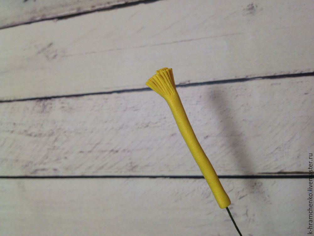 - Бутон такого цветка должен содержать еще и тычинки. Вы можете купить их в специализированном магазине или изготовить самостоятельно. Для этого отрежьте три кусочка проволоки длиной 3,5 см и приделайте к каждой из них по маленькому шарику из желтой полимерной глины. Поместите конструкцию в духовку, а после того, как тычинки высохнут и остынут, смажьте их клеем и окуните в манку. Окрасьте высохшую манку в желтый цвет.