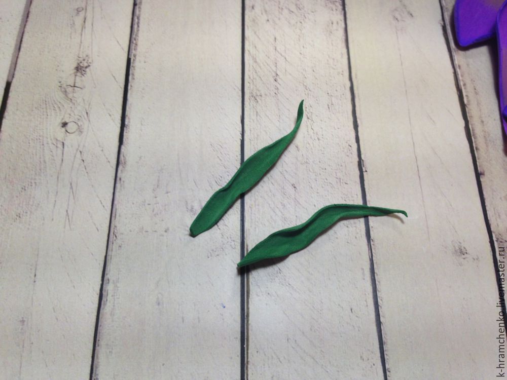 Когда наша выкройка готова, переносим ее на фиолетовый ФОМ, вырезаем 6 лепестков (для одного цветка) и 2 листика вырезаем из зеленого ФОМа (можно и больше).