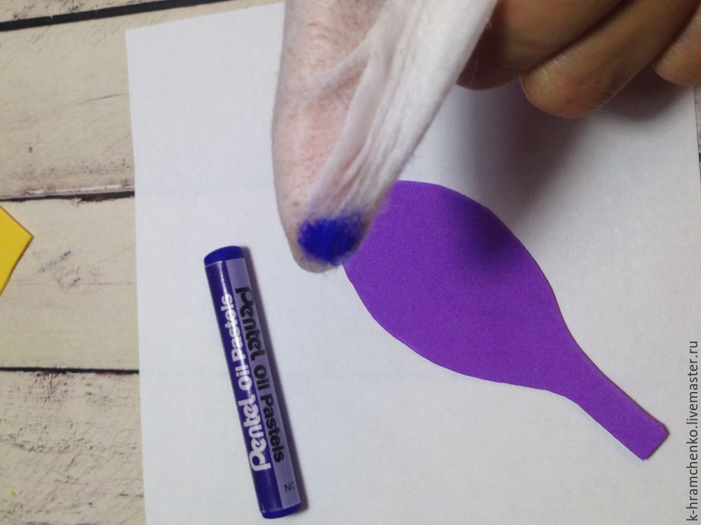 Далее, переходим к тонированию лепесточков. Влажной салфеткой и синей пастелью тонируем края лепестка, с двух сторон. И, конечно же не забываем про торец!