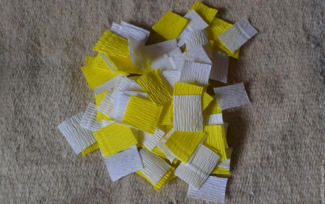 Для этого нужно из гофрированной бумаги нарезать равные квадраты, которые затем оборачиваются вокруг палочки для суши или деревянной шпажки.