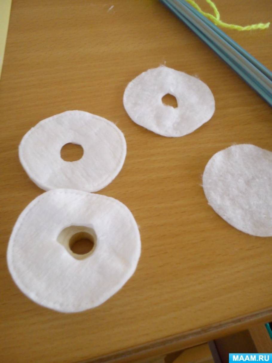 Ватный диск и шерстяная нить, а также термопистолет с клеем.